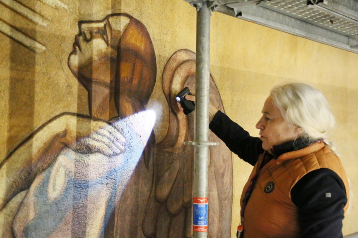 Les prochains travaux sur la nef et le chœur devraient suivre le même protocole à ceci près, que les interventions sur la composition de la Glorification de Saint Louis s’opéreront sur des peintures murales industrielles (stic B) et non sur des fresques.